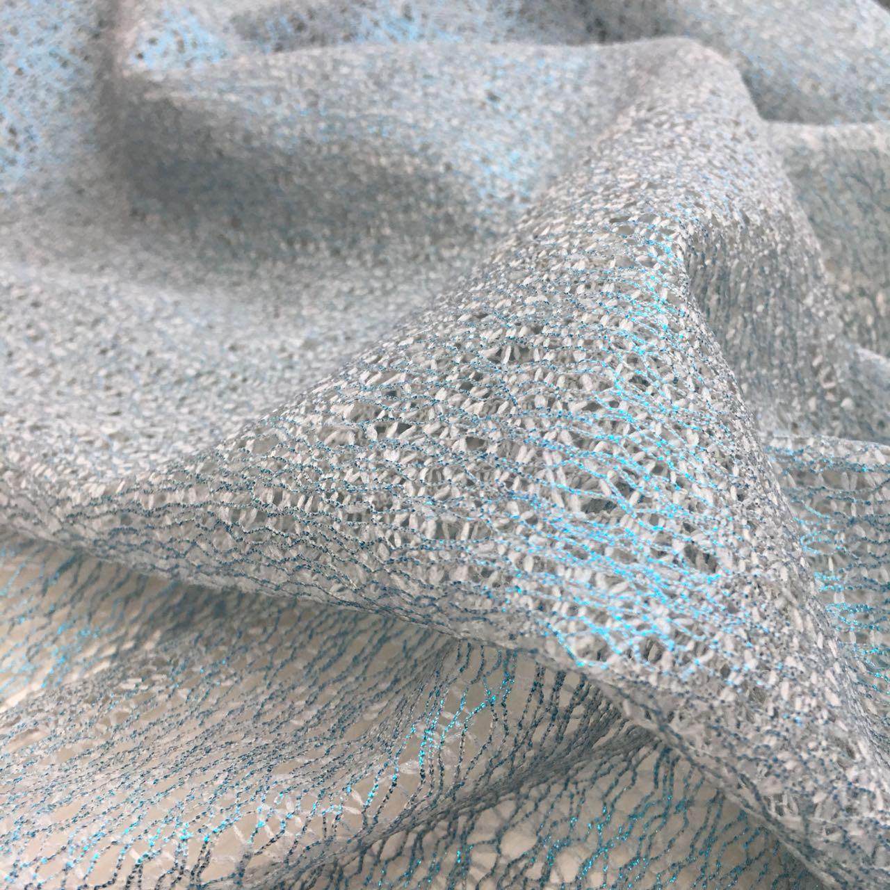 ОписаниеПрозрачный материал, по фактуре напоминающий хаотично сплетенные нити. На лицевой стороне ткани нанесено металлизированное напыление. Она хорошо тянется и легко драпируется в складки. Подойдет для пошива нарядных топов и праздничных платьев.