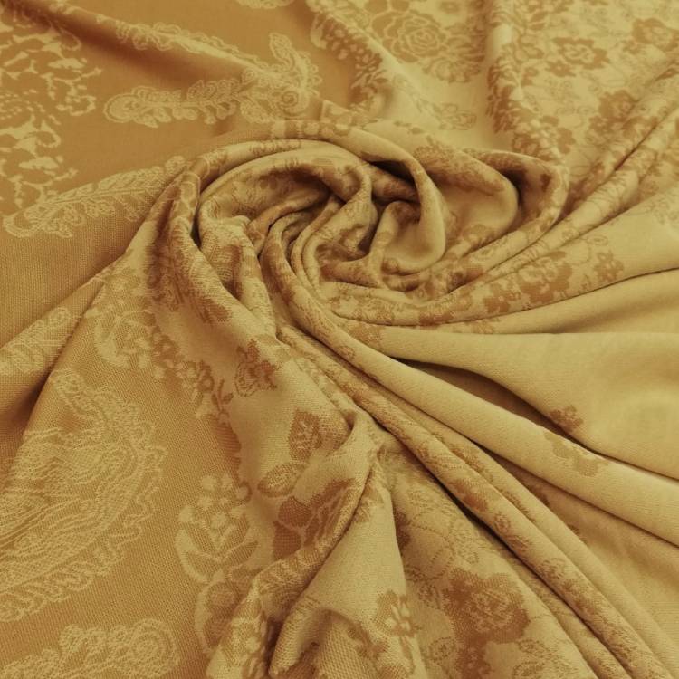 ОписаниеТрикотажное полотно средней плотности, эластичное и износостойкое. Лицевая сторона матовая, жаккардовая. Изнаночная сторона гладкая, ровная, мягкая.Вискоза, входящая в состав ткани, придает полотну дополнительную мягкость, делая его приятным на ощупь, не электризуемым. Трикотаж прекрасно подходит для пошива платья, жакета, юбки, кардигана.